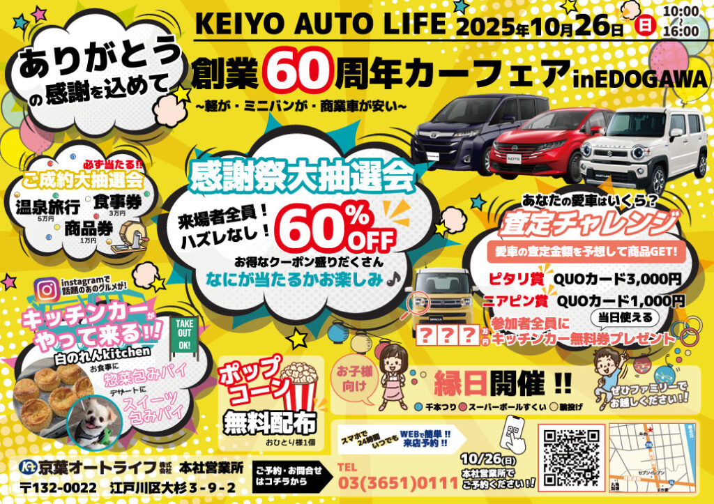 60周年 感謝祭 葛飾区奥戸 カーフェア 車の査定 査定チャレンジ 査定金額予想 キッチンカー無料券 参加者全員 車いくらになる?